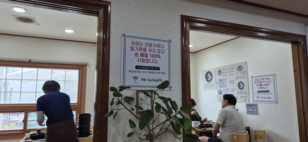 "전분가루나 밀가루를 절대 섞지 않은 순메밀 100%메밀막국수"랍니다. 벽에 쓰여지길